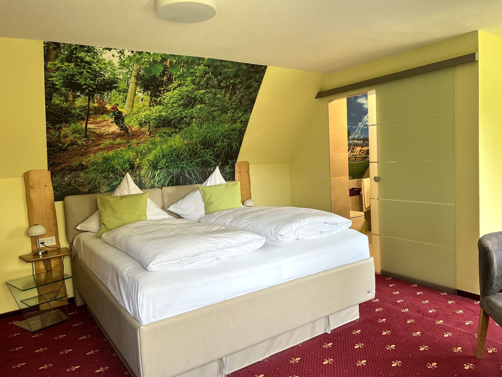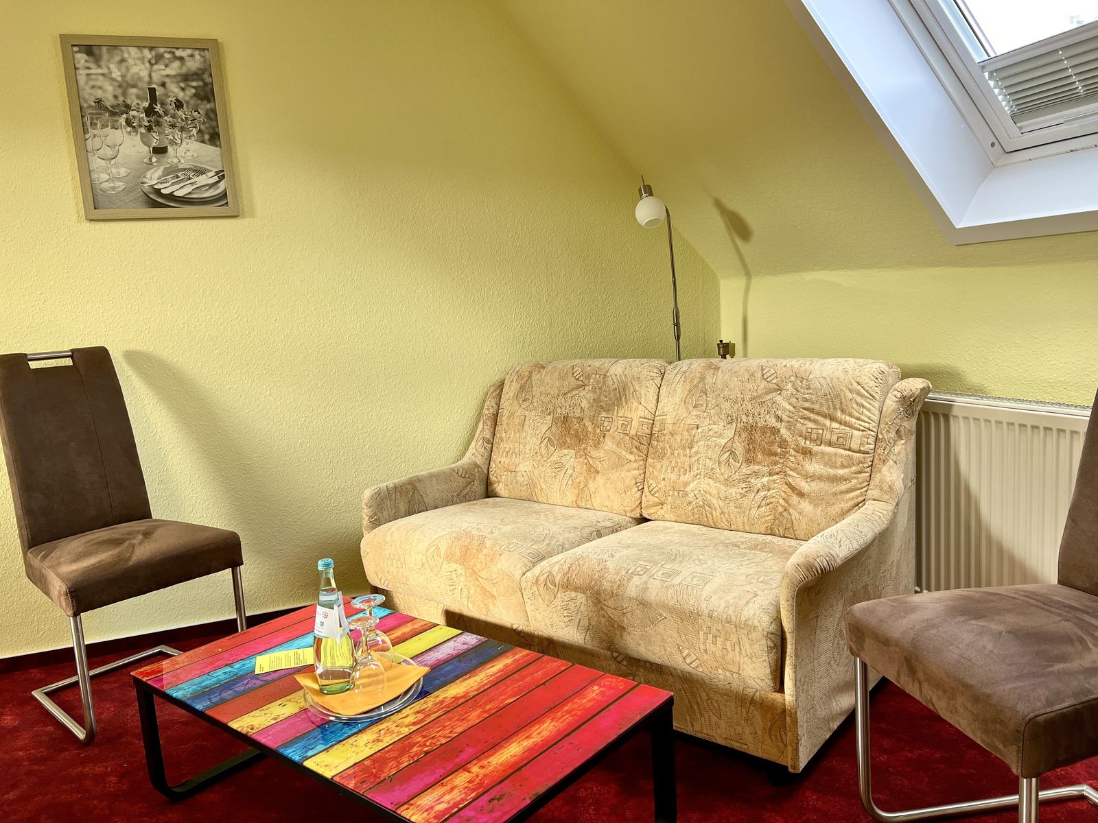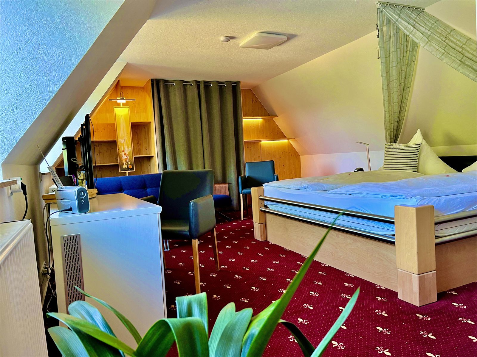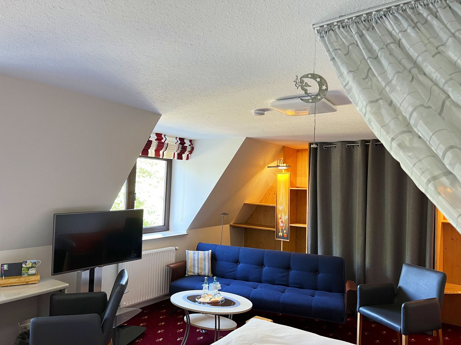großzügiges Zimmer mit Wasserbett (200 x 220 m) und gemütlicher Couchecke in der 2. Etage, begehbare Dusche Dachschräge und Blick ins Tal