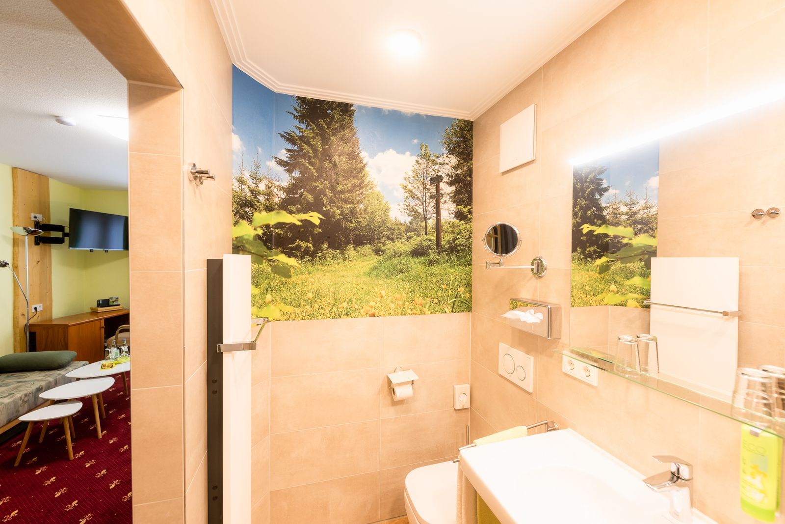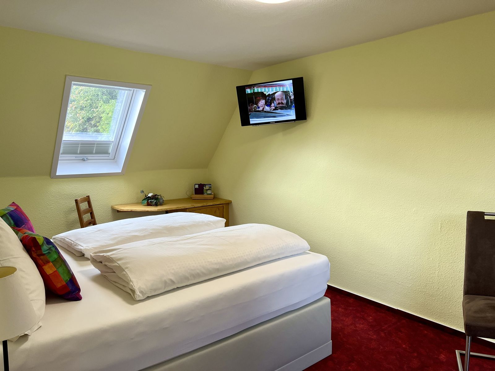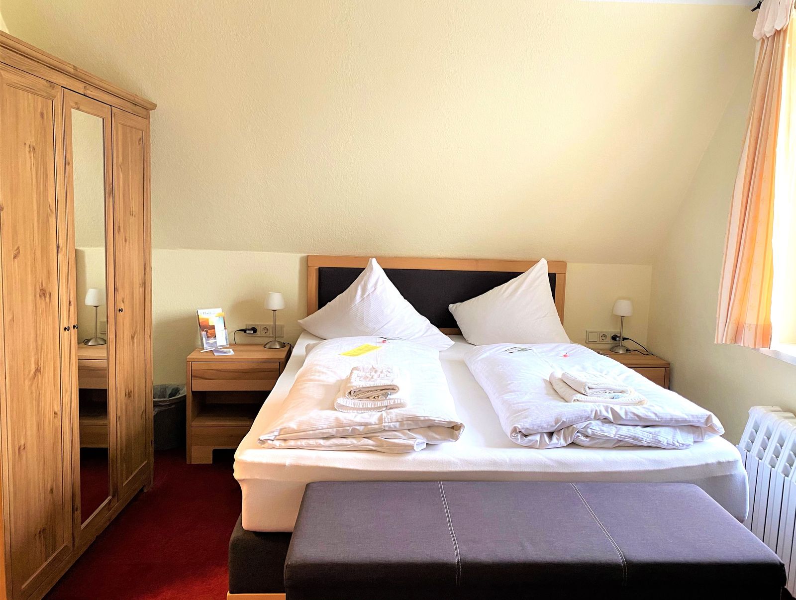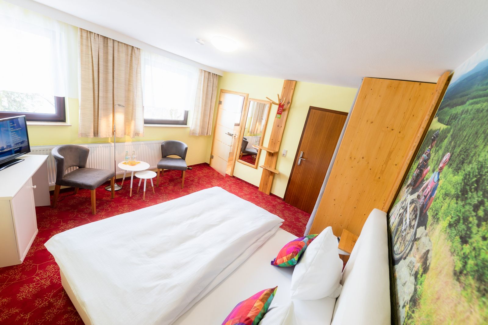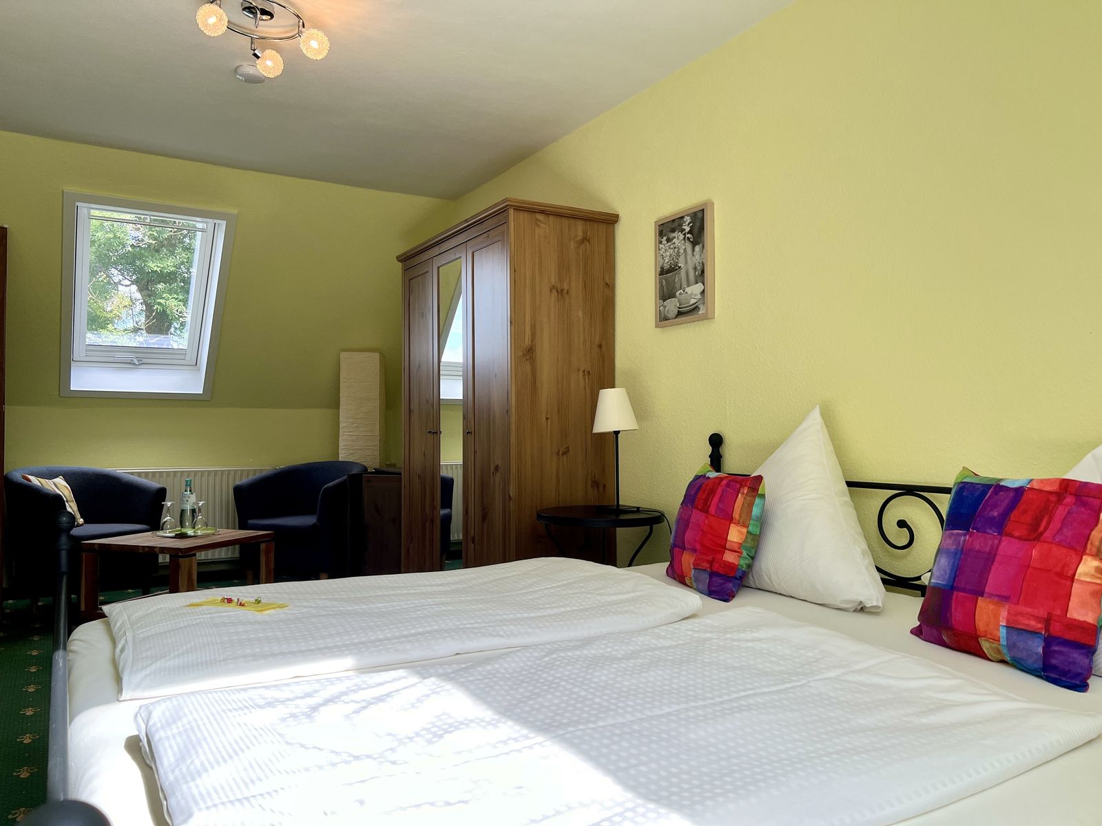 großzügiges Zimmer mit Wasserbett (200 x 220 m) und gemütlicher Couchecke in der 2. Etage, begehbare Dusche Dachschräge und Blick ins Tal