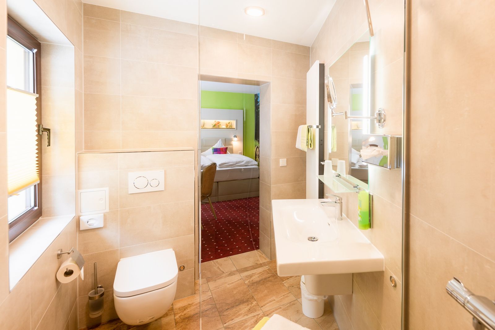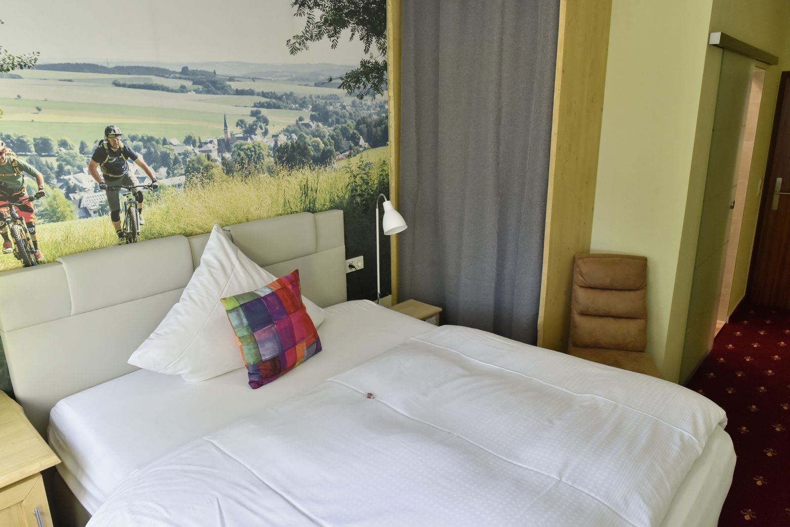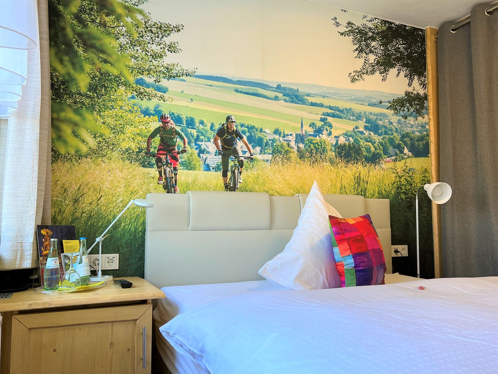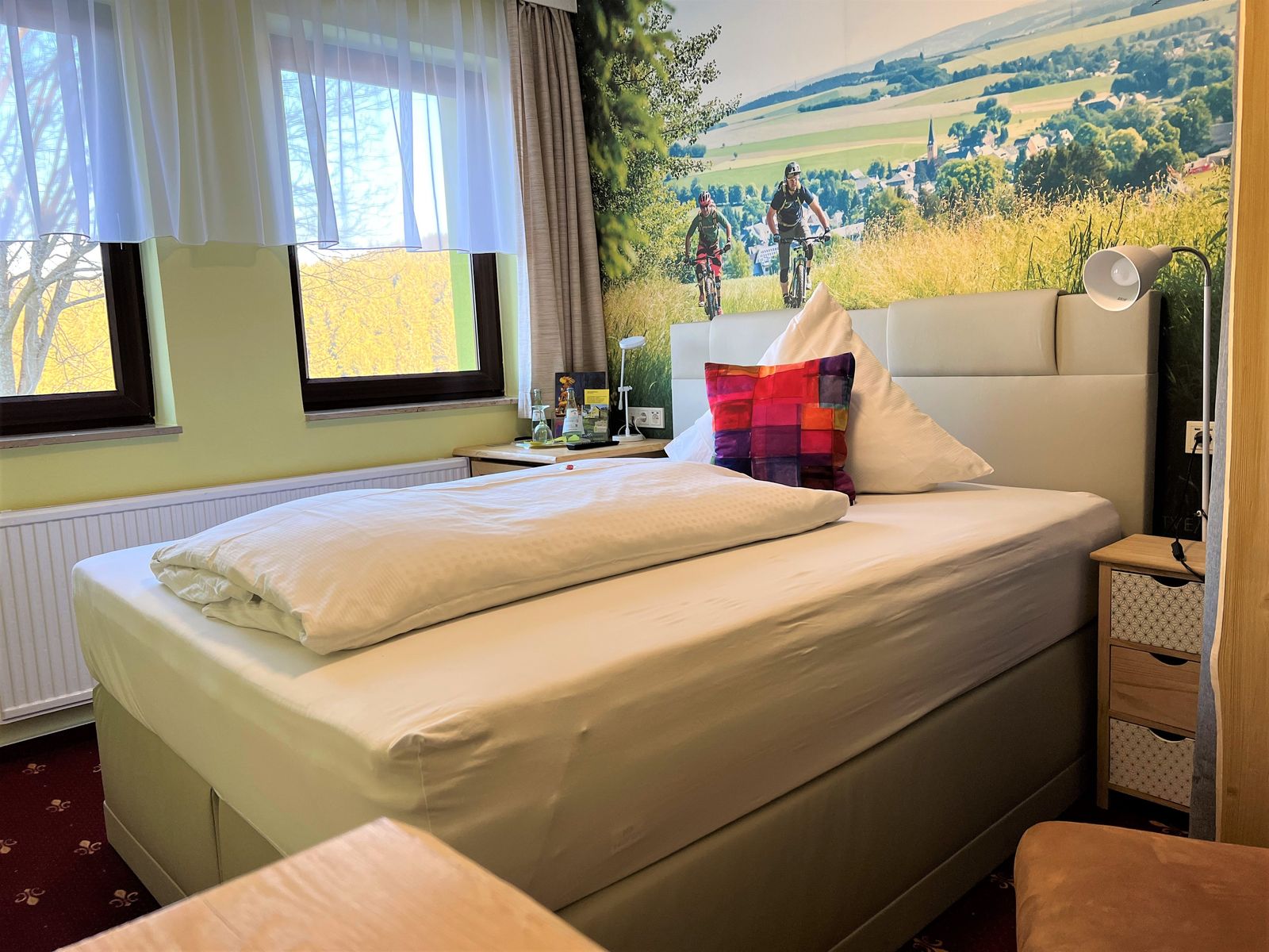 großzügiges Zimmer mit Wasserbett (200 x 220 m) und gemütlicher Couchecke in der 2. Etage, begehbare Dusche Dachschräge und Blick ins Tal